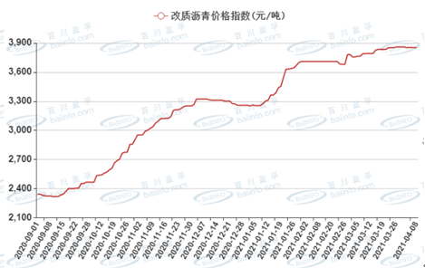 自2020年三季度開(kāi)始,中國(guó)煤瀝青市場(chǎng)呈現(xiàn)一路上行趨勢(shì)。百川盈孚指數(shù)自2500元/噸漲至3800元/噸附近,漲幅高達(dá)52%。2021年一季度煤瀝青延續(xù)上行趨勢(shì),累計(jì)上行幅度600元/噸左右,截止季度末,主產(chǎn)區(qū)鋁用改質(zhì)出廠參考3750-4050元/噸,石墨制品出廠參考3800元/噸,中溫瀝青出廠參考3400-3700元/噸。