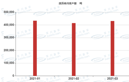 2021年第一季度月度平均開(kāi)工率分別為:50.13%、47.4%、51%。煤瀝青第一季度總產(chǎn)量約127.9萬(wàn)噸,環(huán)比減少4.85萬(wàn)噸,降幅為3.7%,同比減少7.81萬(wàn)噸,降幅約為5.8%。